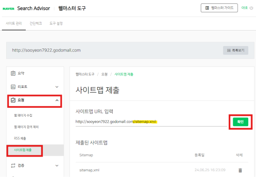 * 사이트맵 URL (웹페이지 URL + /sitemap.xml) 기입 후 ‘확인’ 클릭